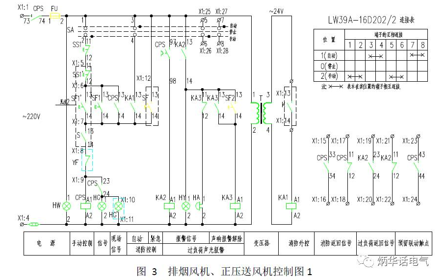 圖3是排煙風(fēng)機和正壓送風(fēng)機控制圖,其主回路參見(jiàn)圖1b,為CPS方案,適合于交流380V單臺消防排煙風(fēng)機或正壓送風(fēng)機的現場(chǎng)控制或兩地控制,過(guò)載保護只報警,風(fēng)口(或風(fēng)閥)上的微動(dòng)開(kāi)關(guān)直接與風(fēng)機聯(lián)動(dòng),消防聯(lián)動(dòng)模塊提供無(wú)源動(dòng)合觸點(diǎn),當消防系統提供有源觸點(diǎn)時(shí),取消變壓器T。只有現場(chǎng)控制時(shí),取消SS1'、SF1'、S、HG'并將X1:5與X1:6短接,X1:6與X1:7斷開(kāi),X1:7與X1:8短接,X1:10與X1:11斷開(kāi)。圖中CPS包含線(xiàn)圈、過(guò)載保護觸點(diǎn),動(dòng)合觸點(diǎn)、動(dòng)斷觸點(diǎn)。用于正壓送風(fēng)機控制時(shí),將X1:8與X1:9短接。